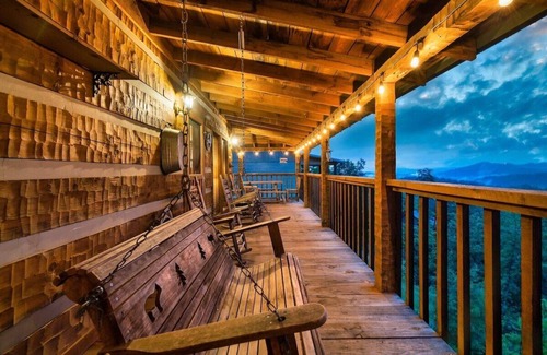 The cabin features a delightful wrap-around deck, where you can soak in the picturesque mountain views from the outdoor rocking chairs or the porch swing. String lights add a touch of magic to your evenings spent outdoors. Don't forget to savor the mountain air while grilling on the charcoal grill or relaxing in the hot tub.