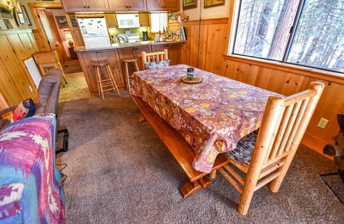 Your family, friends, and pets will be "reel" cozy in this charming 2 bedroom, 2 bath plus loft chalet located in the quiet neighborhood of Pinebrook, which includes access to the small private lake along with a clubhouse, ball field, creek-side picnic area, horseshoes, and sand volleyball court. Outfitted in classic cabin decor, this sweet retreat features everything required for a relaxing mountain getaway – including a fully-stocked kitchen, roomy dining area, and spacious great room with beamed ceilings, wood-burning stove, rock hearth, and large wall of windows. Amenities and entertainment include foosball, Wifi, cable TV, free nation-wide long distance calling, DVD player, games, forced air heat, and air conditioning. The level lot and driveway provide easy year-round access with plenty of room for parking.