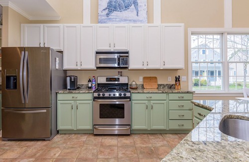 This stunning 4-bedroom home spans 2,400 square feet across 2 stories and has been completely re-furnished from top-to-bottom. It is situated on a corner lot with a pond view and an attached garage, comfortably accommodating up to 12 people.