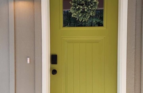 The lime green door marks the spot where you can leave your cares behind and enjoy a relaxing get away. This cottage has clean lines and natural textures of polished stone, stunning granite and rich walnut cabinetry. It has a huge master king suite with curbless, walk in tiled shower, a second bedroom with a queen bed and a second bathroom with tub/shower; all on the main level with your kitchen, dining, living room and laundry. While the lower level has an additional full bathroom with a shower, a 3rd bedroom with a queen bed and 4th bedroom that has 2 twin beds that look like tents and a pull out trundle - super cool for kids to feel like they are having their own camp out for the week!