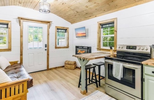 Our cottage is brand new and clean. The rocking chair front porch, outdoor hammock, and outdoor picnic table for eating offer an escape while traveling that you cannot find at hotels. Inside, you will find a full size kitchen, two tvs, an electric fireplace, and a stackable washer and dryer. The bedroom contains a queen size bed, and the LR futon converts into a full size bed if needed.