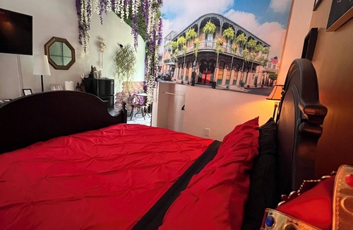 This unique hotel room has a King Victorian bed and transports you to a French Quarter garden in New Orleans.