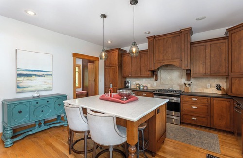 Well-equipped kitchen with gas range, spacious island, dishwasher, and multiple coffee options (standard drip-style, Keurig, and coffee grinder).