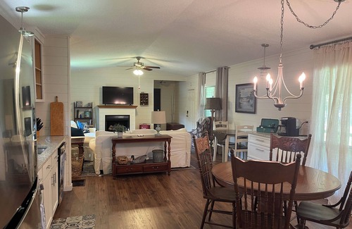 Grandaddy Moon sure knew this place was special when he bought it more than four decades ago. Though times and amenities are much different now, the beauty and uniqueness of this place are apparent more than ever. Here you’ll enjoy modern conveniences with nostalgic fish camp decor. Shiplap walls and soft colors create an inviting and tranquil space. “Full Moon Fish Camp” is located less than 4 miles from The Guntersville City Harbor in a small, quiet and safe lake front community. You’ll find the walls adorned with local art and furnishings that give nod to life on the lake. Launch your boat at the nearby ramp (2 mi) then tie up to the community pier to take a break from the sun. Prepare meals in the well appointed kitchen or go into town (by boat or car) to enjoy one of the many restaurants within 4 miles of here. Fire up the charcoal grill after a day of fishing or shopping if staying in is what you’re after. The relaxing front porch has plenty of seating and is the perfect place to sip your favorite beverage morning or night. Sounds of wildlife, rain on the metal roof or the occasional clang of a nearby sailboat halyard will surely set the tone for an unforgettable stay. Our little cove is a wildlife protection area so the natural beauty can’t be duplicated. Whether you spend a day shopping in quaint downtown Guntersville (4 mi), make the quick drive into Scottsboro to Unclaimed Baggage (24 mi) or head to Huntsville to the US Space & Rocket Center (37 mi), you’re sure to find just what you’re looking for. With parking for 4-5 vehicles/boats (2 covered spots), there’s plenty of room for everyone. Snuggle in on one of the two couches in the living room to watch a movie or pull for your favorite team on the 50” TV. You’ll find good sleep comes easy in any of the three sleeping quarters. “Full Moon Fish Camp” has been providing the absolute best memories for our famly for decades and we’re sure you’ll make some great ones here too. While it’s not quite the same fish camp that Grandaddy Moon had, we know he’d approve.