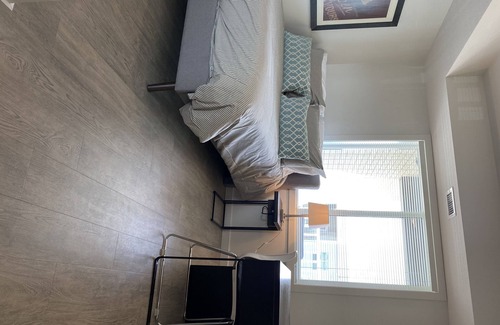 3 bed 3 full bath, bright spacious condo. 930 sqft. Modern Fully stocked kitchen.One underground parking space with visitors parking above. W/D,A/C. Sunny covered deck with Patio seating. Extremely clean and comfortable.