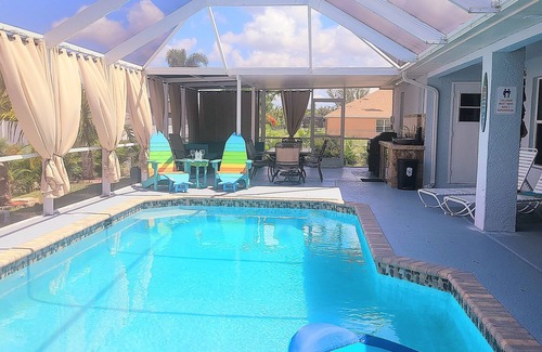 Welcome to Areca Palms! Your beautiful vacation home in Tropical Southwest Cape Coral. Our spacious 2100 sq ft, 4 bedroom, 3 full bath home accommodates 8 people. Located in a quiet neighborhood, it is fully equipped & tastefully appointed with everything you will need to relax on your vacation in paradise! Close to shopping, restaurants, nightly entertainment, golf courses, beaches, marinas, boat ramps and much, much more! Sunsplash Family Waterpark is only 5 minutes away. Beaches are 15 minutes to an hour away depending on which beach you go to. Open the triple glass sliding doors in the great room and access your outdoor living space where you will find the outdoor kitchen complete with Blackstone flat top and normal grills. There is plenty of outdoor relaxation space to sit and enjoy as you swim in the heated pool, chill in the spa, watch tv, or shoot a game of pool with friends. The child pool safety fence is located in the garage and is super easy to set up.