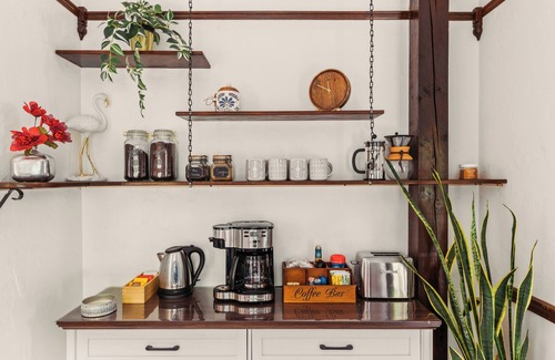 - Fully stocked kitchen featuring modern appliances, cookware, and a coffee & tea bar