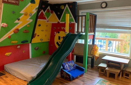 We may not have the fanciest house but we are contenders for the fun-est! We have a dedicated play-space for children that includes an indoor climbing wall, library and toys! We have a cozy couch for the entire family to enjoy by the fireplace. The outdoor space is where we shine. We have a sun facing deck with lots of space to socialize, a swing and a dedicated campfire area to share your day's adventure.