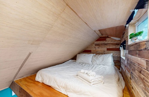 Afterward, head inside to whip up a quick snack in the kitchenette featuring a mini-fridge, microwave, toaster oven, and coffee maker. As the evening winds down, have fun playing darts, stream all your favorite shows on the smart TV, or test out your musical talent using the electric guitar and amp! There’s even a desk if you need to get a little work-from-home done. Before retreating to your lofted bed, unwind amidst the shimmering starlight of the disco ball spinning overhead.