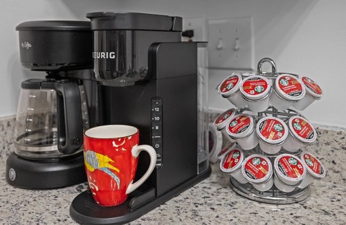 Your FULLY STOCKED KITCHEN has: cooking and bake ware, complete set of utensils, waffle maker, full sized oven toaster, coffee station, kettle with tea cup sets, place mats, oven mit, and the kitchen is equipped with cleaning supplies. Your dining room can easily fit 4-6 people comfortably. IN-HOUSE WASHER AND DRYER IS AVAILABLE inside the unit.