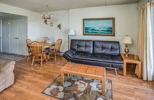 This unit is a great option for guests who value location and convenience over modern finishes. The main bedroom includes a queen bed, and the living room offers a sleeper sofa, accommodating up to four guests. A flat-screen TV and DVD player provide in-room entertainment, and a wood stove adds a cozy touch for those cooler beach evenings.