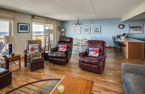 The great room joins the dining room and kitchen to provide ample, open space for all guests. Included in the living space is a queen-size sofa bed, ample recliners and dining table and chairs. A large flat-screen TV and DVD provides television and movie entertainment via DISH and Wi-Fi. For warmth and ambiance an electric fireplace sits in the room. The main bedroom also has a large flat-screen TV and a king bed. The walk-in shower adjoins the room and a chair is available to make it ADA. The second bedroom has a queen-size bed and the second shower/bath is adjacent in the hallway. Looking out the two west patio doors in the main living area or sitting on the adjoining deck, one can enjoy the full view of the ocean. When not taking in the beautiful view or listening to the breakers you can enjoy the pool/hot tub accessible via the elevator to the basement or take a stroll to the beach.