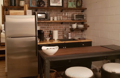 New York loft feel. Private porch. King bed. Full bath. Studio kitchen. 2 burner instant hot stove top, Breville Convection toaster oven, microwave, full sink. No dishwasher or oven. Living space and kitchen open floor plan. Fantastic design.. Super comfy for a couple. Not recommended for more than 2 people. One shared bed. This flat is below the house. This apartment is a PRIVATE UNIT! The house above is also available. Both properties are very private with separate entrances only a shared driveway. The upstairs is also a rental unit. If you are sensitive to noise above (similar to apartment living) this may not be a good match for you. We do have a pretty large porch exclusively for this unit.