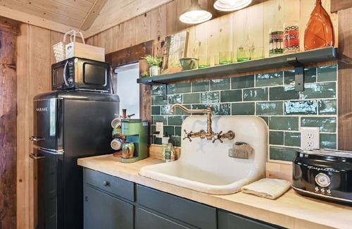 Decorated with our guests comfort in mind, this sweet little cabin will have you feeling right at home. Offering a gas fireplace and a comfortable living space for you to unwind and relax. The kitchen is perfectly suited for two, with a microwave, mini fridge, mini oven and coffee maker.