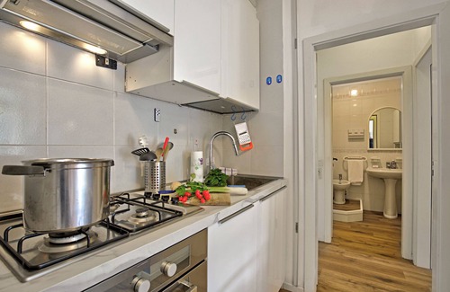 The apartment features a well-equipped open plan living space furnished with a double sofa bed, a wardrobe and a flatscreen smart digital TV. This area also incorporates a small kitchen fitted with a Moka coffee machine, an oven, a cooker hob, a dishwasher and a fridge freezer.