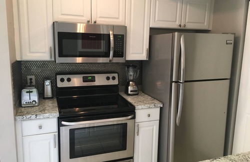The living room includes a sleeper sofa for any additional quests joining you as well as large LED TV with cable for your entertainment. The kitchen is fully equipped with all brand new stainless appliances and two barstools to start with cocktails before dinner. Enjoy eating at your dining room table overlooking the lake, fountains and palm trees with warm breezes. The bedroom has a new extremely comfortable queen size bed and large walk-in closet. The recently updated full bathroom is right off the bedroom with provided linens and towels. For your convenience, the condo includes a washer/dryer in a utility room off the kitchen.