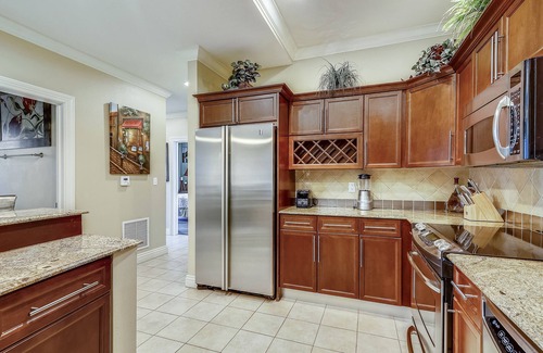 ⭐ The kitchen has a Fully equipped refrigerator, stove, oven, microwave, dishwasher, cookware, bakeware, glasses, mugs, plates, flatware, cooking utensils, coffee maker, and fire extinguisher under the sink.