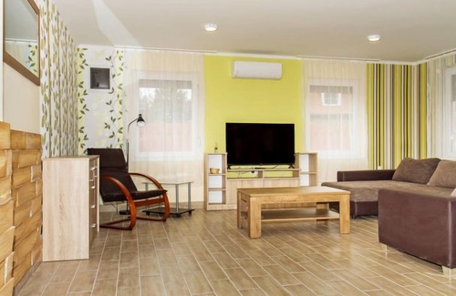 Balatonkeresztúr 20 km from Keszthely: Beautiful semi-detached house, 2 storeys. In the resort, 200 m from the lake. Private: garden. In the house: WiFi, air conditioning (extra). Grocery, restaurant, grass beach 200 m, thermal baths "Marcali" 14 km. Well-known lakes can easily be reached: Hévíz Thermal 25 km.