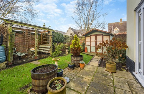 Outside, the lovely, enclosed south-facing garden offers a serene setting to enjoy the outdoors. Garden furniture is provided for al fresco dining or relaxing in the sun. The summer house, equipped with comfortable seating, is the perfect spot for reading a good book or enjoying a drink in a peaceful atmosphere. There is also private off-road parking for two cars.
