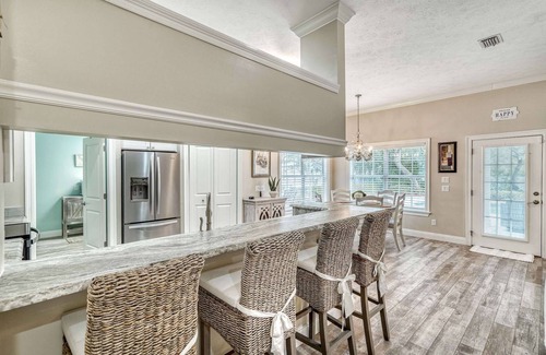 The well-appointed home includes an open main living area and full kitchen large enough for multiple people to cook together. Dining available for everyone at the dining table overlooking the pool deck and the nearby breakfast bar. Dine al fresco in the backyard! An outdoor table and grill are available.