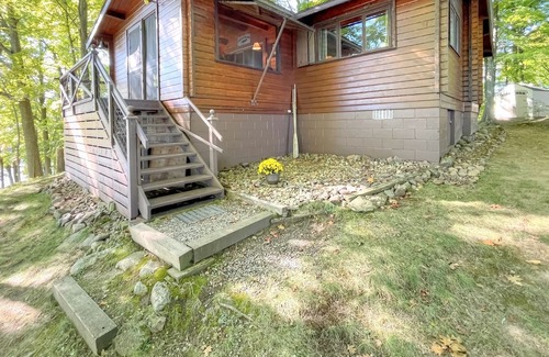 This log cabin has three bedrooms and two full bathrooms. Bedrooms: 1 queen in the master bedroom, 2nd bedroom has 2 single beds , and the 3rd bedroom has a bunk-bed with a double bed on bottom single on top. It also comes with a kayak, swim ladder on dock , a screened porch, fireplace with gas logs. This is a 4 1/2 acre private island and you will be the only people on the whole island! This cottage comes with2 adult kayaks 2 kids kayaks, and a canoe.