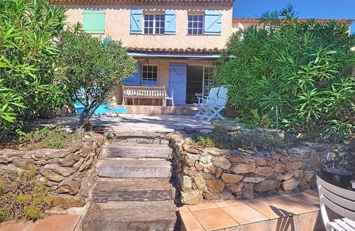 In the heart of the Mas de Gigaro estate, this two-storey semi-detached farmhouse opposite the communal swimming pool features a bright living room with open-plan, fully-equipped kitchen, opening onto a lovely terrace with sea views.