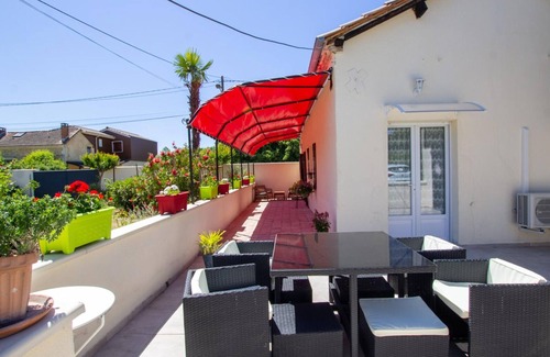 Covered terrace of 18 m2 in front of the cottage with barbecue and garden of 1500 m2 to share with the owner.