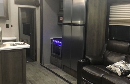 This glamper is beautiful. All the bells and whistles nestled on our property in fallbrook in between beautiful landscapes. Close to the vines where you can stroll leisurely and look at the beautiful sunset and duck pond. The kids will love the upper bunk and you will feel right at home. This glamper is located below our residence and you are 30 minutes from Oceanside beach and close to all the beauty that SoCal provides. The kitchen is fully stocked with everything you need. At an additional fee a grill can be provided for your use. This trailer is a beauty. You can view the model it’s a Dutchman voltage 4115 online