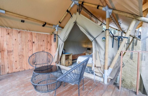Located in a dreamlike setting surrounded by forests and mountains, this luxury tent offers a unique experience of comfort and tranquility. Our tents feature a queen-size bed with bedside tables and a covered outdoor seating area.