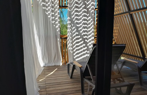 Glamping House with two terraces on both sides of the house with deckchairs for enjoyment and relaxation. The garden is equipped with a solar shower to cool off on hot summer days, outside furniture, two hanging deckchairs, and a barbecue. The power in the house is enabled by solar panels, and the freshwater is supplied by the river Vrioštica which is just next to the house. The house is heate by the fireplace on wood.