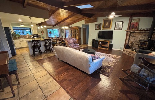 This is a fantastic Vacation Rental. The moment you drive into the large circular driveway and see the towering Oaks, Cedars, and Horse sculpture, you will understand the magic of our forest. The surrounding gardens will enchant you, all year round. Central Heat and AC, in addition to wood burning stove stocked with dry wood. Enjoy a two person soaking bath tub in the master bathroom lit by a dimmable chandelier with a view of the stars and garden.