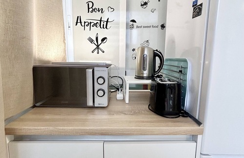 KITCHEN with washing machine, refrigerator, oven, microwave, ceramic hob, blender, electric coffee maker, kettle, toaster and kitchenware. Also napkins, oil, vinegar, salt and pepper, coffee, sugar ...