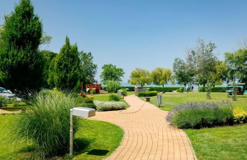 Siófok: Apartment block "Golden Gate". 50 m from the lake, 100 m from the beach, direct access to the beach. For shared use: park 2'000 m2, well-kept garden. Barbecue, fireplace, children's playground (slide, swing, sandbox). In the complex: reception, lounge with TV, WiFi, sauna (extra). Hot tub (extra). Table tennis, lift. Parking space n 11. Indoor swimming pool 500 m. Fishing possibilities 50 m. Please note: fishing [permit required].