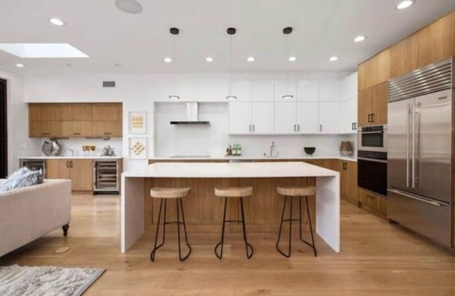 Luxury chef’s kitchen that's attached to the living and dining room. This large open format is excellent for entertaining. The 20-foot Nanawall door allows you to open the indoor space to the outdoor area where another dining table is available.
