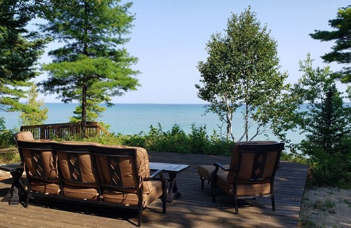 This large family home, set on a bluff at the end of a road near the Beaver Island Lodge, sits on 12 acres and 500 feet of north shore wooded frontage. It has beautiful northern views that span Whiskey, Squaw and Garden Islands. On a clear day, the upper peninsula comes into view! Sunsets and sunrises from the expansive deck provide Golden Hour enjoyment for all.