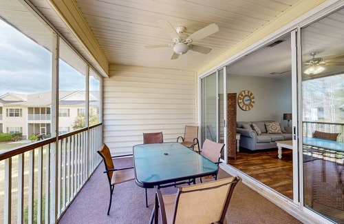 When you book this two-story retreat, you are also granted access to on-site community amenities, including an outdoor pool, easy access to three golf courses, a practice facility, a clubhouse, and a hot tub. When you enter this air-conditioned townhouse, you will encounter an open floor plan with luxury vinyl floor treatments, a neutral color palette, and tasteful furnishings. The kitchen boasts modern white cabinetry, major appliances, an eat-in area, and gorgeous granite countertops with a breakfast bar overlooking an additional dining area. The living room is generously sized and extends through the sliding doors onto a large screened balcony with an outdoor dining area, perfect for relaxing.
