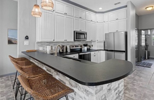The Home itself is 4 bedrooms, plus a private Den area. The mas-ter suite is conveniently located on the left side of the home for privacy. It has a king size bed with a bench, french doors and two large sliding patio doors that open up to the breathtaking views of your backyard oasis. The master bedroom features a 5x5 pol-ished porcelain shower with dual rain-shower heads, split marble-topped comfort height vanities with under-mount sinks & oil-rubbed bronze fixtures, and a water closet with comfort height toi-let. Additionally, a large closet, ceiling fan, Roku TV, sound ma-chine, alarm clock, full length mirror, with plenty of outlets and charging stations. Blackout curtains in each bedroom, blinds in the den.