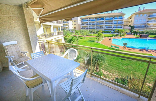 Nice 2 bedroom flat in first line of the beach with spectacular views to the sea and the swimming pool. The flat Golf de Sant Jordi has 2 double bedrooms, bathroom with bathtub, well equipped kitchen and nice living-dining room. The accommodation has a large terrace with extraordinary views to the beach and the communal area. The Golf Santa Jordi complex also has extensive gardens and a large communal swimming pool. The port is only 450 m away from the flat, which makes it the ideal flat to spend a quiet holiday next to the beach and without the need to take the car.