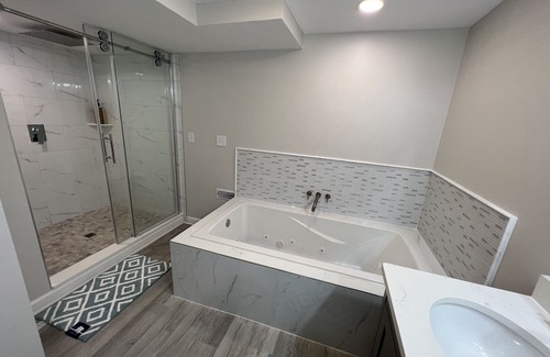 This unique and beautiful 2-story, fenced single-family home boasts 5 bedrooms, 2 fully equipped kitchens, and exclusive parking for up to 5 cars, including a detached parking garage for a mid-sized car/SUV. Enjoy a keyless entry and a welcoming porch with rocking chairs. The living room features a wall-mounted 65-inch LG smart TV and opens to 4 bedrooms upstairs and 1 bedroom downstairs, including a master suite on each floor. The home sleeps up to 10-12 adults with the option to add an air mattress. There are 5 Smart TVs throughout the home. All 5 bedrooms come with high-end mattresses, including Nectar and Euro-top, and most of them smart TVs with Netflix, Amazon Prime, and Disney subscriptions. 2 Full bath including a beautiful luxurious bath downstairs which has a beautiful Walk in shower and 2 people jetted bathtub. The 4th bedroom upstairs opens into a spacious private backyard, with a good size deck. The lower level has a beautiful romantic themed downstairs bedroom with lights for ambience and 43 in LG TV. Large open living room with kitchen downstairs and good place to entertain a large group. There is another room downstairs which has a futon/sofa and can sleep 1 person. There's also a spacious backyard with a deck, grill, and outdoor dining. A flexible check-in and checkout time is available based on availability. Experience luxury and comfort in the heart of Broad Ripple, just 10 minutes from nightlife, restaurants, and shopping centers.