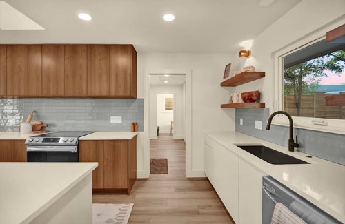 Come home from a long day of Austin work or play to your private organic modern retreat! Fully remodeled from head to toe featuring a chef's kitchen, a butler's pantry, and a peek-a-boo office, the three bedrooms and two bathrooms are perfect for any type of stay. With full 8-foot privacy fencing in the back yard your pooches and kiddos will both make themselves at home and any visiting friends or family will have no trouble meeting up with you for an Austin backyard BBQ.
