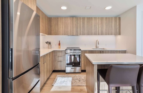 These sleek spaces feature stainless steel appliances, quartz countertops, and ample soft-close cabinetry. Select units boast floor-to-ceiling bay windows and private balconies.