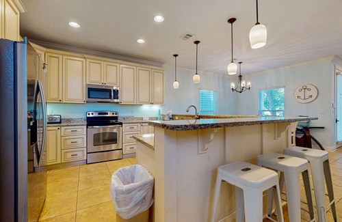 Experience the ultimate beach getaway at "Polka Dot Bikini" in the exclusive gated community of Villages of Crystal Beach in Destin, FL. This spacious 4-bedroom, 3.5-bath house is ideal for larger families looking for a luxurious vacation retreat. The fully equipped kitchen features granite counters, stainless steel appliances, a dining table, and a breakfast bar, perfect for preparing meals and entertaining guests.