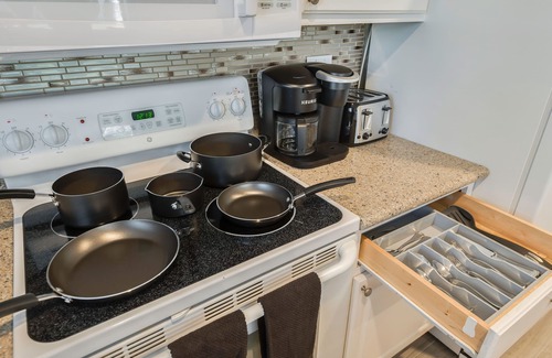 - Fully Stocked Kitchen w/ Pots, Pans, Plates, Glasses, & Utensils