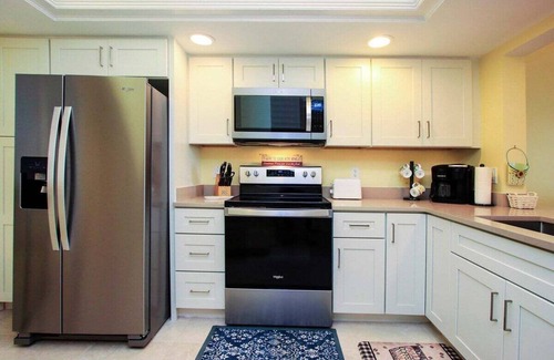 The fully equipped, updated kitchen boasts white raised-panel cabinets, solid surface countertops, and modern appliances, perfect for preparing delicious meals to enjoy with loved ones. The open floor plan flows seamlessly into the dining and living areas, creating a welcoming space to unwind after a day in the sun.