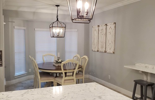 This beautiful, spacious home offers 7 bedrooms (2 of them are master suites) and 6 bathrooms. Each room has its own TV and is beautifully decorated. With a total of 4000 sqft this home can sleep up to 24 and has a spacious great room just off of the modern kitchen. With a dining room, eat in kitchen and kitchen island with bar style seating there is plenty of room for dining.