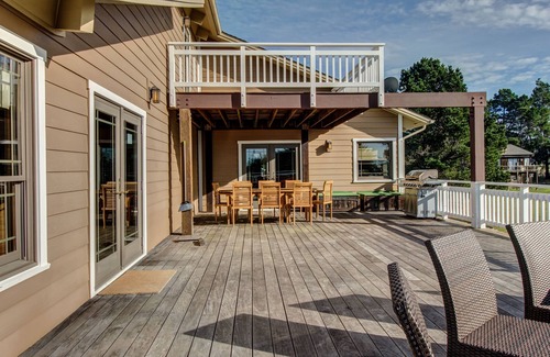 Your vacation begins in the great room, which features exposed beam ceilings and plush leather furnishings that will make you feel right at home. Admire meadow, forest, and partial ocean views through the picture windows, relax in front of the wall-mounted flatscreen TV, or use the WiFi to check your email. Prepare meals as a family in the open gourmet kitchen, which offers a farm sink, black granite countertops, 48-inch professional range, and modern appliances that include a dishwasher. Each morning, you can sip a cup of coffee in the window seat before setting the breakfast table in the window-lined dining room.