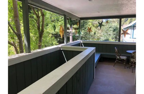 This beautifully renovated, uniquely decorated 5 bedroom home is located amidst the redwoods in a lovely, quieter neighborhood just 4 minute drive from town and a short 3-minute walk to river access. Enjoy the lovely open kitchen, dining room, living room space that flows out onto the front deck with additional seating, two cozy day beds and a 6 person hot tub. Heads up... lots of stairs, no bbq and no tv at the house. But the wifi is strong for streaming.