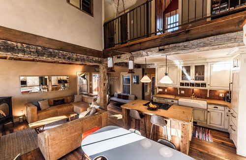 You'll appreciate the architectural details of reclaimed post and beam construction, high vaulted aspen tree ceilings, and reclaimed heart of pine wood floors. And when the weather is chilly, cozy up in the living room by the gas fireplace.