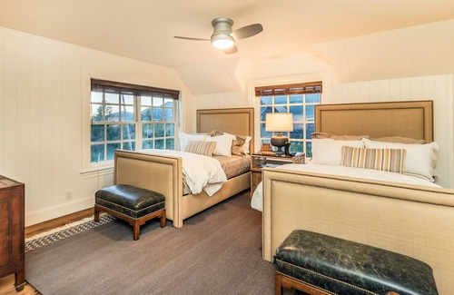 Professionally designed interiors make this home stand out from other mountain retreats, with traditional and modern pieces paired in a fresh, inviting way. Relax in the sunroom and living room, which are linked by a double-sided fireplace and feature stone and wood floors, chic diamond-patterned area rugs, crisp white slipcovered sofas and chairs, and a built-in bar. The dining area seats eight around a pedestal table, with additional room at the breakfast bar in the fully equipped chef’s kitchen. The villa’s main floor also has a separate den and office for quiet reading or catching up on emails.