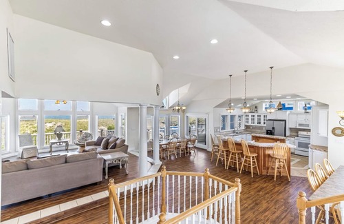 Top Level: King en suite with jetted tub in the private bath with gas log fireplace, half bath, kitchen with 2 dishwashers, a refrigerator, and raised island bar (seats 4), 2 dining areas (each seat 8), great room with Smart TV, gas log fireplace and ocean views, loft area with seating, screened porch with ocean views, deck access with panoramic ocean views.